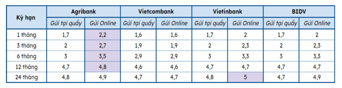Ở kỳ hạn 12 tháng, lãi suất huy động trực tuyến của Agribank đang dẫn đầu ở mức 4,8%/năm, cao hơn 0,1% so với gửi tại quầy. VietinBank và BIDV hiện cùng niêm yết mức lãi suất 4,7%/năm, không có chênh lệch giữa gửi online và gửi tại quầy. Vietcombank là nhà băng duy trì lãi suất kỳ hạn 1 năm thấp nhất, chỉ 4,6% cho cả 2 phương thức gửi tiền.