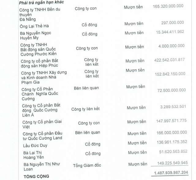 Tính tới thời điểm 30/06/2020, ông Hà và con gái đang cho Quốc Cường Gia Lai mượn số tiền tổng cộng gần 52 tỷ đồng, trong tổng cộng gần 1,5 nghìn tỷ đồng mà QCG đi mượn của các bên liên quan, được ghi nhận trong các khoản phải trả ngắn hạn khác.