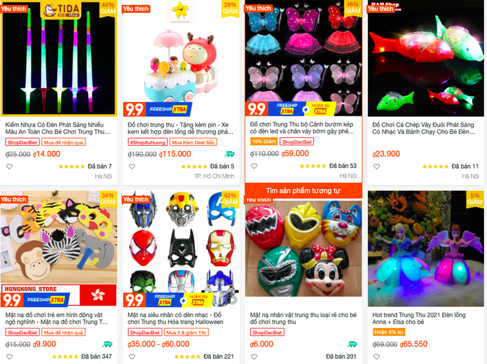 Khảo sát của phóng viên tại các sàn TMĐT như Lazada, Tiki, Sendo, Shopee cho thấy, hiện trên các gian hàng đều đồng loạt chào bán đồ chơi Trung thu với giá khá rẻ. Cụ thể, mùa Trung Thu năm trước đèn ông sao loại nhỏ có giá từ 15.000 - 20.000 đồng/chiếc nay chỉ còn 5.000 đồng/chiếc; loại lớn có giá dao động từ 50.000 - 70.000 đồng/chiếc nay chỉ còn trên dưới 30.000 đồng/chiếc; đèn lồng truyền thống năm trước giá từ 100.000 đồng/chiếc nay chỉ còn trên dưới 50.000 đồng/chiếc.