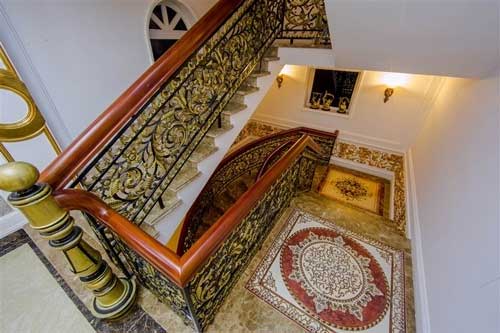 Cầu thang được chạm trổ tinh xảo. Lý Nhã Kỳ từng so sánh họa tiết trang trí của căn biệt thự với trang phục cao cấp của thương hiệu Abberta Ferretti. Cột nhà và hoa văn trên trần nhà lấy cảm hứng từ lâu đài cổ điển Pháp.Yêu thích kiến trúc nghệ thuật hoàng gia châu Âu, Lý Nhã Kỳ chọn phong cách này để trang trí cho căn hộ của mình.