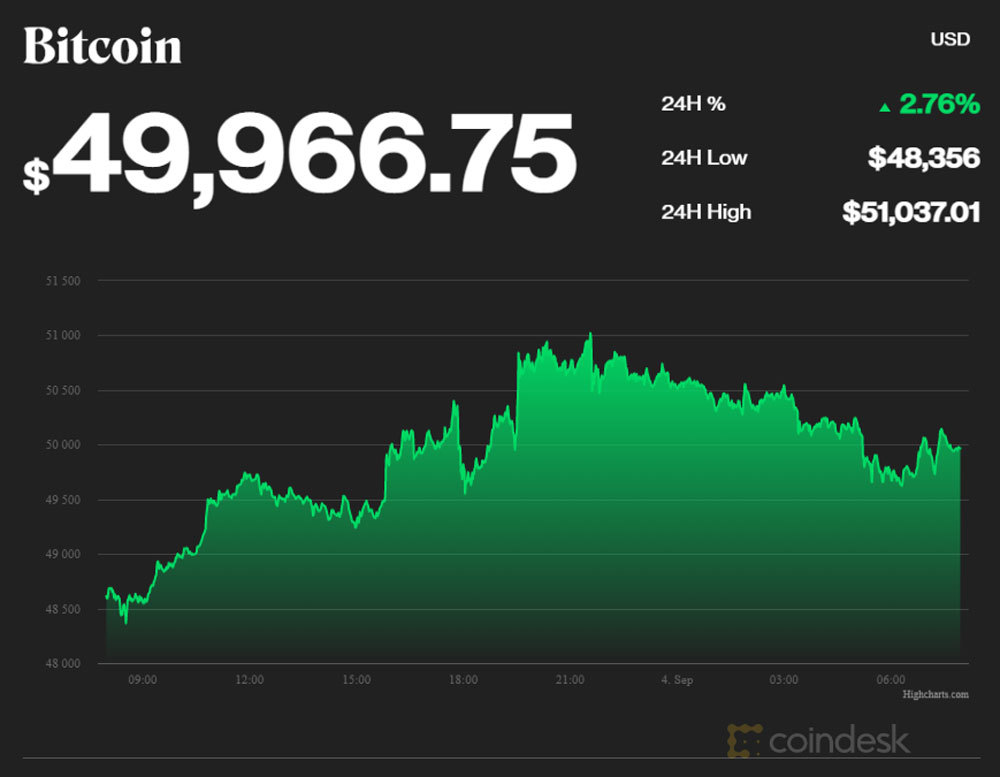 Dữ liệu của CoinDesk vào 7h58' hôm nay (giờ Việt Nam) cho thấy, giá Bitcoin hiện được giao dịch ở mức 49.966,75 USD, tăng 2,76% so với ngày hôm qua. Trong 24 giờ qua, giá Bitcoin thời điểm cao nhất đạt 51.037,01 USD, thấp nhất ở mức 48.356 USD.