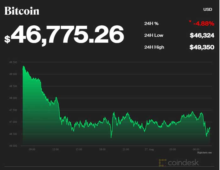 Có thể thấy, thị trường Bitcoin tiếp tục có sự biến động lớn về giá. Sau khi chính thức xuyên thủng ngưỡng 50.000 USD (mức cao nhất trong vòng hơn 3 tháng qua) vào ngày 23/8 sau nhiều tuần mắc kẹt ở vùng 30.000-40.000 USD/đồng, giá Bitcoin vào ngày 25/8 rơi xuống ngưỡng 47.000 USD/đồng. Đến sáng nay, giá Bitcoin tiếp tục lao xuống, mất mốc 47.000 USD, về mốc 46.000 USD.