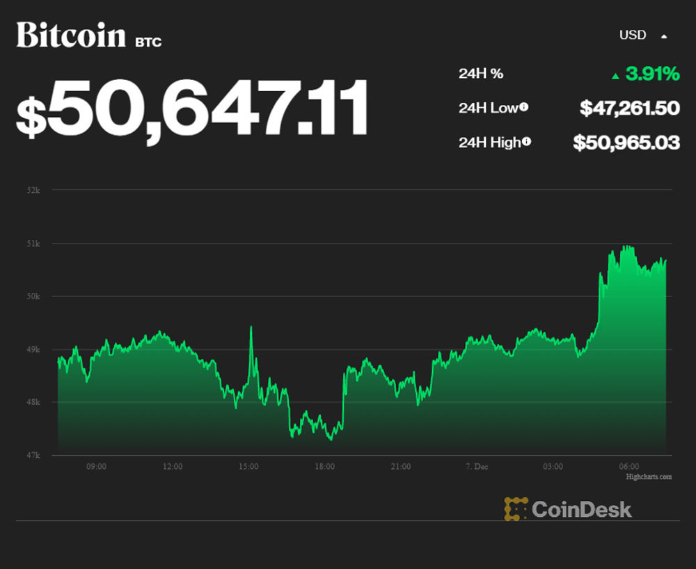 Theo dữ liệu cập nhật từ CoinDesk vào lúc 7h30' sáng nay (7/12, theo giờ Việt Nam), giá Bitcoin được giao dịch ở mức 50,647.11 USD, tăng 3,91% so với ngày hôm qua. Trong 24 giờ gần nhất, giá Bitcoin thời điểm cao nhất đạt 50.965,03USD, thấp nhất ở mức 47.261,50 USD.