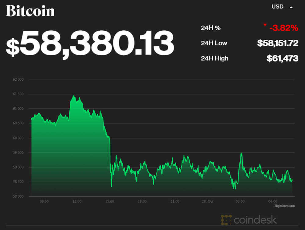 Dữ liệu của CoinDesk lúc 8h hôm nay (28/10, giờ Việt Nam) cho thấy, giá Bitcoin được giao dịch ở mức 58.380,13 USD, giảm 3,82% so với ngày hôm qua. Trong 24 giờ qua, giá Bitcoin thời điểm cao nhất đạt 61.473 USD, thấp nhất ở mức 58.151,72 USD.