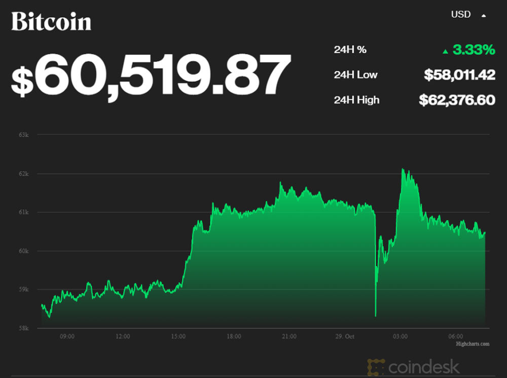 Tuy nhiên, đến sáng nay (29/10), đồng Bitcoin đã quay đầu tăng giá mạnh, có thời điểm trên ngưỡng 62.000 USD. Các đồng tiền mã hóa khác cũng leo giá mạnh.