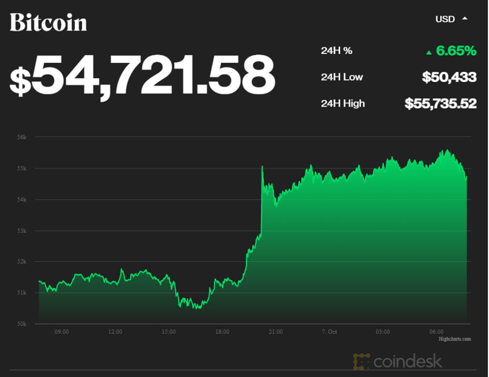 Giá Bitcoin đã lấy lại mốc giá quan trọng 50.000 USD/đồng vào ngày 5/10. Chuyên gia tài chính Craig Erlam (có trụ sở tại London) nhận định, ngưỡng 50.000 USD/đồng là phép thử lớn của Bitcoin. Sau khi vượt mốc này, giá Bitcoin sẽ nhanh chóng bùng nổ.
