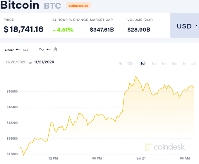 21/11/2020 16:38Bitcoin tăng vọt, tiến sát 19.000 USD một đồng