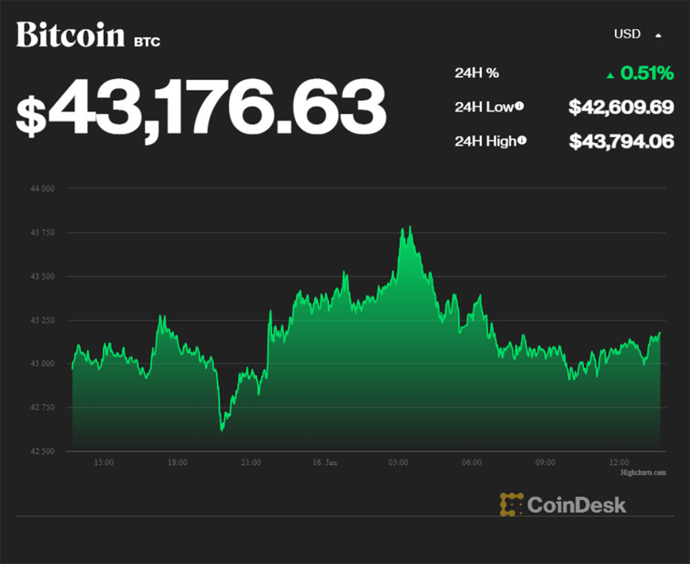 Cụ thể, theo dữ liệu của CoinDesk lúc 13h42' hôm nay (16/1, giờ Việt Nam), giá Bitcoin được giao dịch ở ngưỡng 43.176,63 USD/đồng, tăng 0,51% so với ngày hôm qua. Trong 24 giờ gần nhất, giá Bitcoin thời điểm cao nhất đạt 43.794,06 USD, thấp nhất ở mức 42.609,69 USD.