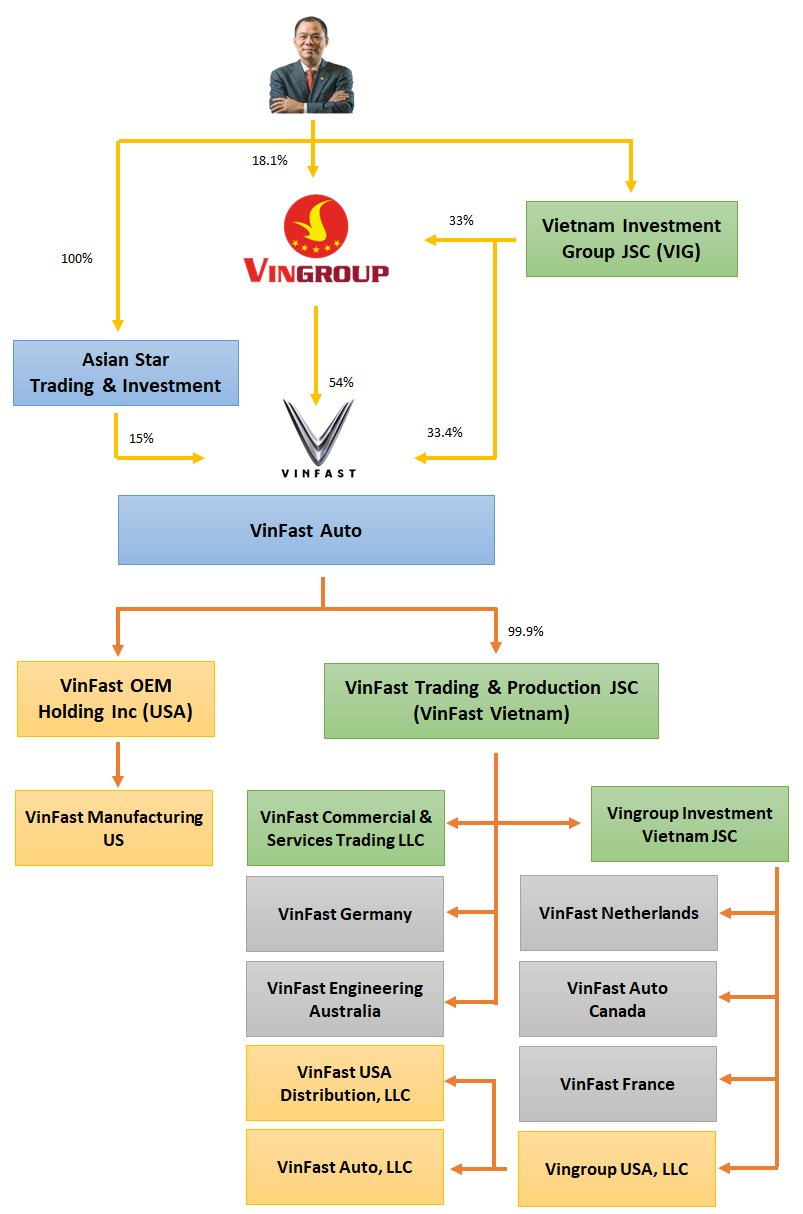 Theo số liệu chúng tôi có được, sau khi sáp nhập với Black Spade Acquisition, tổng lượng cổ phiếu đang lưu hành của VinFast Auto là hơn 2,307 tỷ cổ phiếu. Trong đó, Vingroup sở hữu 51,36%, hai công ty đầu tư riêng thuộc sở hữu của ông Phạm Nhật Vượng là CTCP Tập đoàn Đầu tư Việt Nam (VIG) sở hữu 33,37% và Asian Star Trading & Investments Pte. Ltd sở hữu gần 15%. Còn lại một phần nhỏ thuộc về các cổ đông khác.