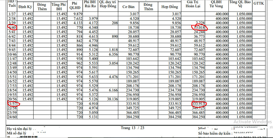 Nếu theo đủ 20 năm, số tiền nhận lại trên hợp đồng của chị Hạnh là 333.9 triệu đồng. Nhưng nếu anh chị dừng hợp đồng ở năm thứ 4, giá trị hoàn lại sẽ chỉ được 13.018 triệu đồng