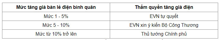 Chi phí đầu vào tăng dẫn đến phải điều chỉnh tăng giá bán lẻ điện bình quân từ 5% trở lên, EVN lập hồ sơ báo cáo. Bộ Công Thương chủ trì, cùng Bộ Tài chính và Ủy ban Quản lý vốn nhà nước tại doanh nghiệp kiểm tra, rà soát và có ý kiến, sau đó EVN được tăng giá điện.