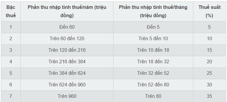 Bộ Tài chính lý giải: Khoản 2 Điều 22 Luật Thuế Thu nhập cá nhân (TNCN) quy định biểu thuế lũy tiến từng phần áp dụng đối với thu nhập từ tiền lương, tiền công với 7 bậc thuế: 5%, 10%, 15%, 20%, 25%, 30% và 35%.