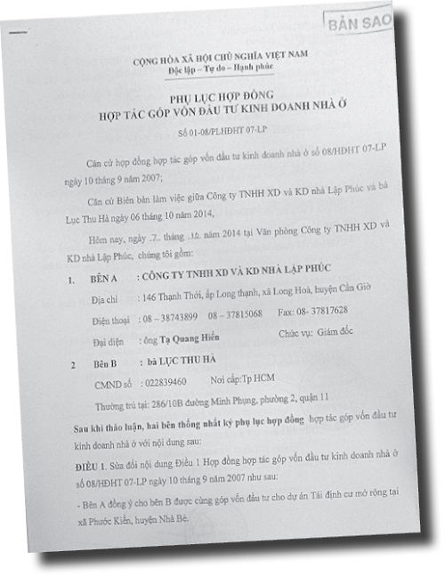 Trong suốt thời gian 7 năm, bà Hà phải mòn mỏi chờ đợi dự án được hoạt động, thế nhưng ngày chờ càng dài ra và vốn góp cho Công ty Lập Phúc cũng trôi theo dự án. Để giải quyết vấn đề trên, ngày 7/10/2014, bà Hà và Công ty Lập Phúc đã thống nhất và đi đến thỏa thuận ký kết phụ lục hợp đồng hợp tác góp vốn đầu tư kinh doanh số 01-08/PLHĐHT 07-LP. Các bên thống nhất chuyển vốn góp hợp tác đầu tư từ dự án Phước Kiển giai đoạn 3 sang dự án tái định cư mở rộng tại xã Phước Kiển, huyện Nhà Bè. Theo đó, sau khi xây dựng hạ tầng kỹ thuật của dự án, Công ty Lập Phúc sẽ giao cho bà Hà đất nền có tổng diện tích 1.000m2.