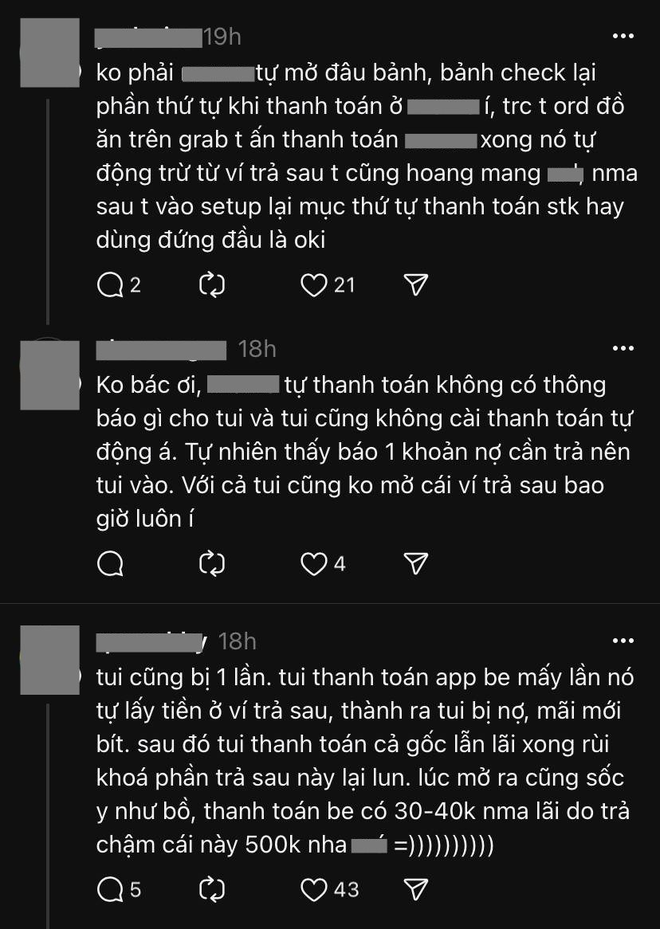 Cô nhấn mạnh rằng bản thân chưa bao giờ có ý định dùng trước trả sau, nên không bao giờ chủ động mở “Ví trả sau”; đồng thời, cũng không cài đặt thanh toán tự động cho bất kỳ hóa đơn hay giao dịch nào, và “Ví trả sau” cũng không phải là lựa chọn thanh toán số 1 của cô khi sử dụng ví điện tử.