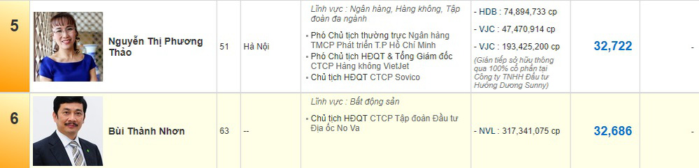 Tuy nhiên mới đây, sự trở lại của cổ phiếu VJC của Vietjet Air đã đưa nữ tỷ phú Nguyễn Thị Phương Thảo từ vị trí thứ 6 vượt qua ông Bùi Thành Nhơn để lọt top 5 người giàu nhất thị trường chứng khoán sau nhiều tháng.