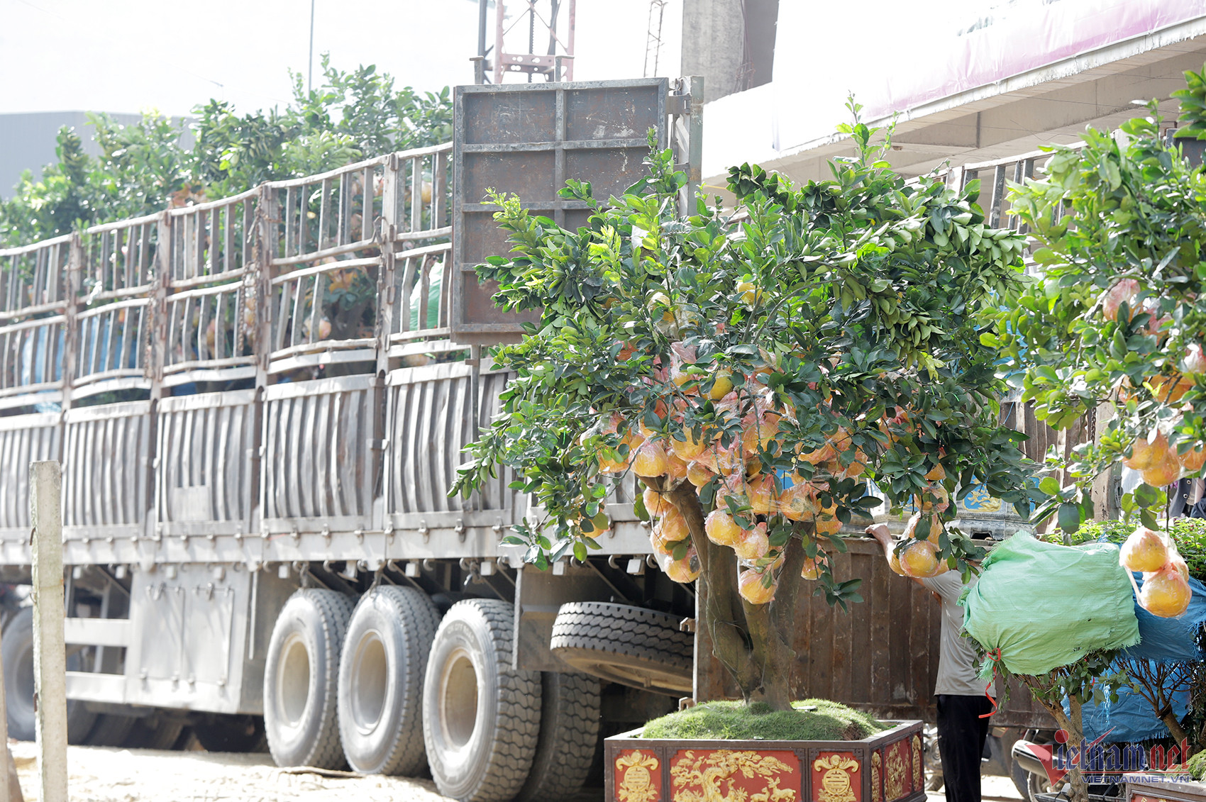 Ghi nhận tại nhiều tuyến phố ở TP. Vinh (Nghệ An) vào cuối tuần qua, nhiều loại hoa, cây cảnh đã được thương lái tập kết dọc hai bên đường để phục vụ người dân mua về trưng Tết. Trong đó, nổi bật nhất là những xe tải chở hàng chục cây bưởi cảnh, trái vàng óng đang được máy cẩu hạ xuống.