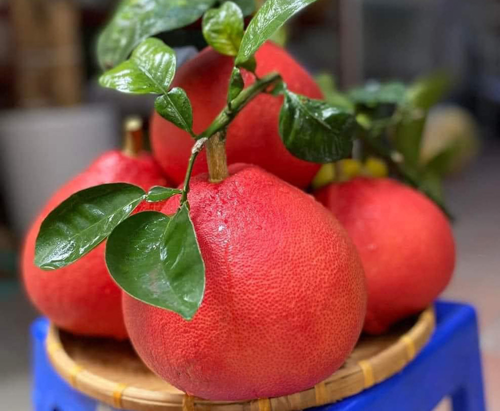 Bưởi tiến vua giá cũng hạ nhiệt và đang “nhuộm đỏ” rực chợ Tết Nguyên đán. Cụ thể, dòng bưởi đỏ dáng chum VIP đủ cành lá có giá 230.000-350.000 đồng/quả; loại trọng lượng 5-6 lạng giá từ 100.000-150.000 đồng/quả; thậm chí một số cửa hàng bán với giá chỉ 50.000 đồng/quả - tương đương với giá bưởi thường bán ngoài chợ.