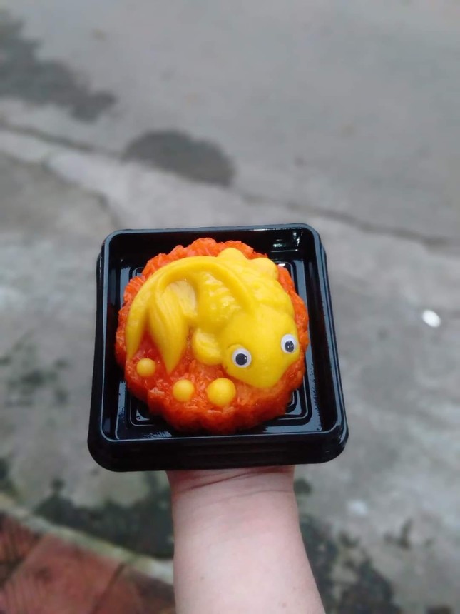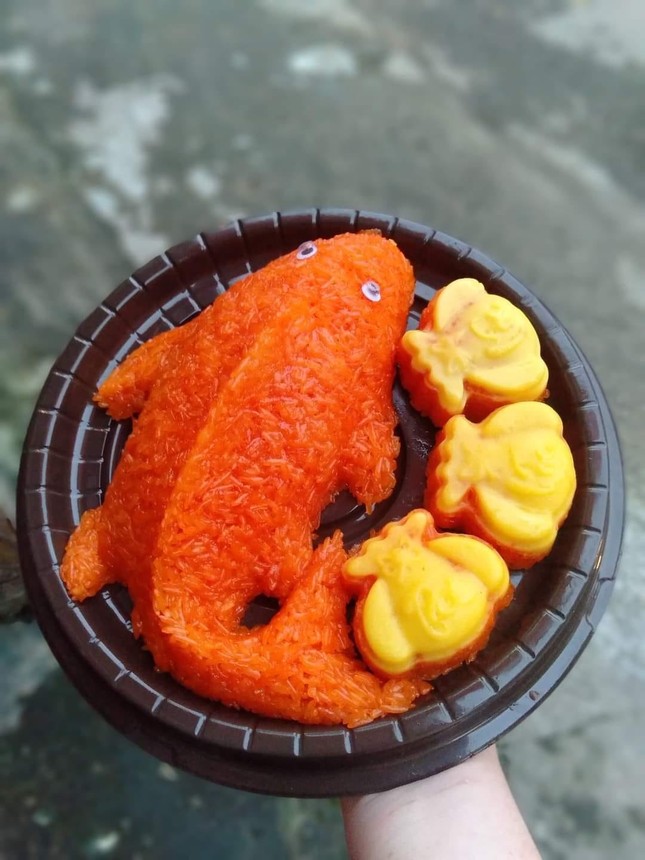 Vừa mới đặt mua một set xôi hình cá chép, chị Ngọc Anh (Hà Nội) cho biết: “Từ năm ngoái do dịch bệnh COVID-19 không thể ra ngoài thả cá chép sống, tôi thấy nhiều người đặt mua các loại bánh trái hình cá chép, trông khá đẹp mắt mà có thể ăn được. Năm nay tôi quyết định cũng đặt mua xôi hình cá chép. Một set xôi gấc có 1 chú cá màu đỏ, dài khoảng 15cm, kèm 3 thỏi vàng với giá 50.000 đồng”.