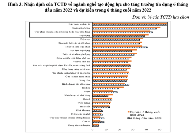 Các lĩnh vực: đầu tư vận tải kho bãi; kinh doanh xuất nhập khẩu; mua nhà để ở và công nghiệp chế biến chế tạo là 4 lĩnh vực có số lượng tổ chức tín dụng dự báo nhu cầu tín dụng tăng nhiều nhất trong năm 2022.