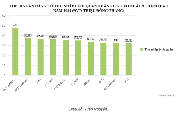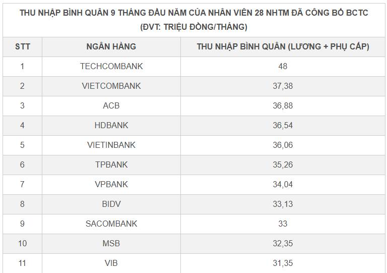 Thống kê của VietNamNet cho thấy, Techcombank tiếp tục là quán quân về thu nhập của nhân viên. Tổng thu nhập bình quân (lương, thưởng, phụ cấp khác) mỗi tháng của nhân viên 9 tháng đầu năm lên đến 48 triệu đồng/người, tăng 3 triệu đồng so với cùng kỳ năm ngoái.