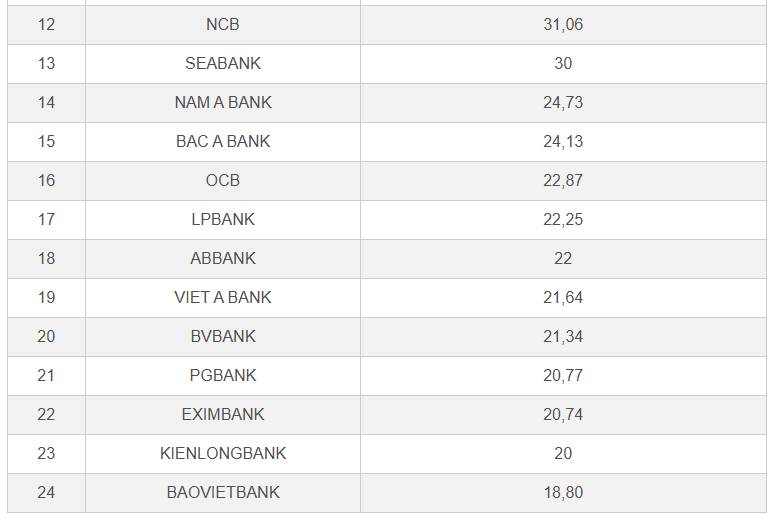 Các ngân hàng có thu nhập bình quân nhân viên trên 20 triệu đồng/tháng còn có ABBank (22 triệu đồng), Viet A Bank (21,64 triệu đồng), BVBank (21,34 triệu đồng, PGBank (20,27 triệu đồng), Eximbank (20,74 triệu đồng) và KienLongBank (20 triệu đồng).