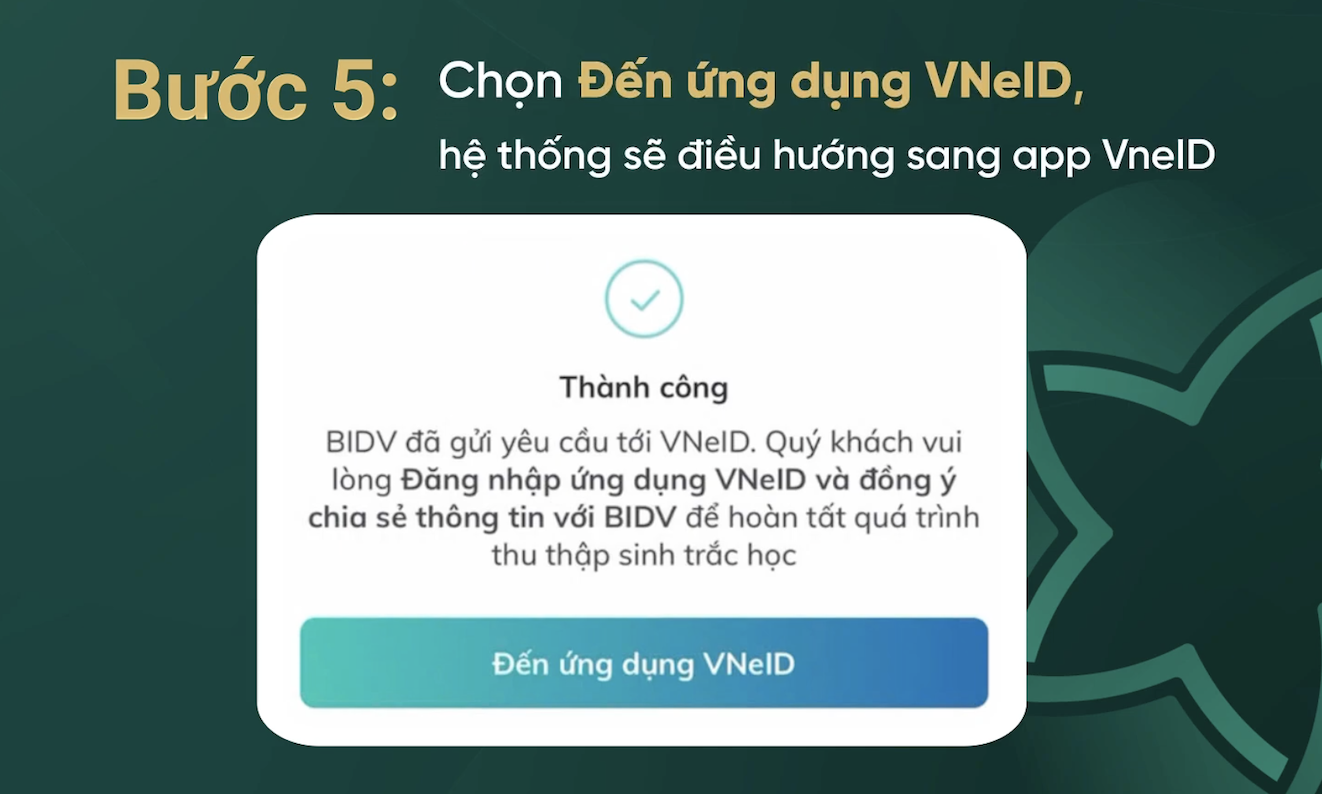 Với việc hợp tác triển khai dịch vụ xác thực khách hàng điện tử thông qua kết nối dữ liệu "app - to - app" giữa SmartBanking và VneID, khách hàng có thể tự thực hiện thu thập dữ liệu sinh trắc học bằng cách kết nối, chia sẻ dữ liệu dân cư từ VNeID sang BIDV SmartBanking mà không phụ thuộc vào thiết bị hỗ trợ đọc chip bằng NFC, không cần tới quầy giao dịch ngân hàng.