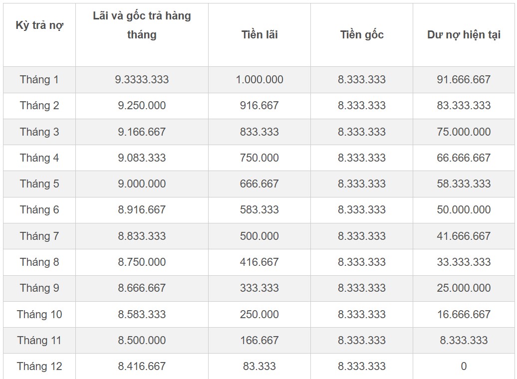 Ví dụ: Khách hàng A muốn vay 100.000.000 đồng trong thời gian 1 năm, lãi suất là 12%/năm, chọn trả đều theo dư nợ gốc hàng tháng. Cách tính lãi và gốc của khoản vay như sau: