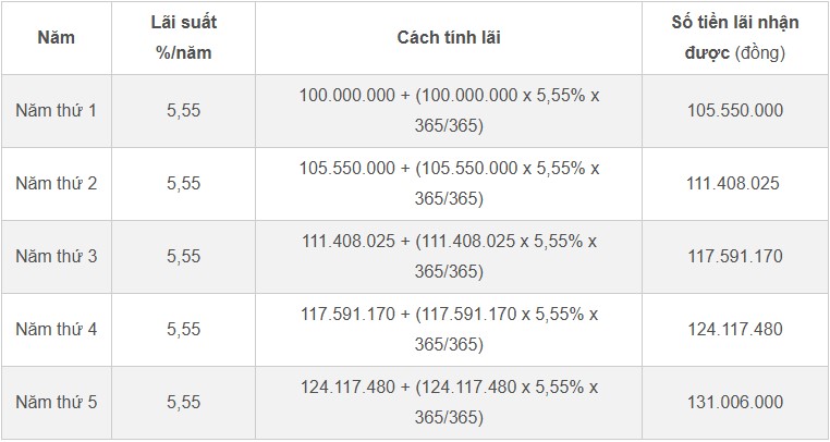 Số tiền nhận được = 100.000.000 đồng x (1 + 5,55%/1) ^ (1 x 5) = 131.006.000 đồng.