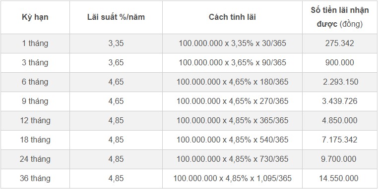 Với các kỳ hạn từ 1-36 tháng, số tiền lãi mà khách hàng nhận được sẽ được tính như sau (giả định các kỳ hạn 1 tháng, 3 tháng, 6 tháng, 9 tháng và 18 tháng, mỗi tháng đều có 30 ngày):