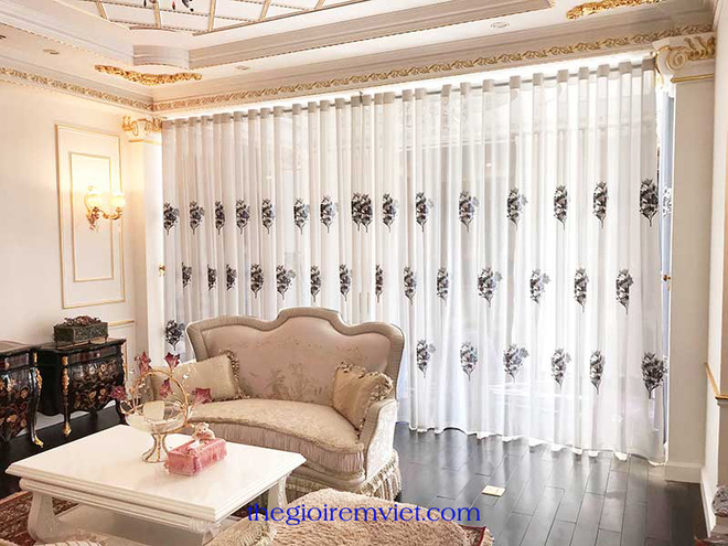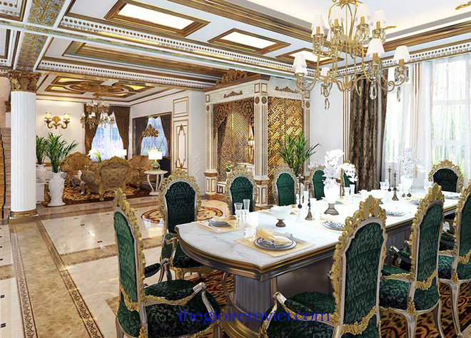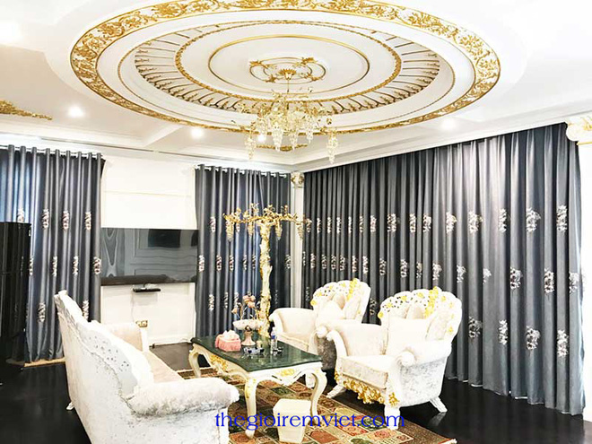 Tiến vào bên trong, căn biệt thự được thiết kế theo kiến trúc kết hợp giữa cổ điển và hiện đại, đơn giản nhưng vô cùng tinh tế. Các nội thất trong nhà rất cầu kỳ, sang trọng. Sàn nhà, tường nhà, trần nhà cho đến những chỉ tường, len tường được tạo đểm nhấn bằng những nét điêu khắc độc đáo.
