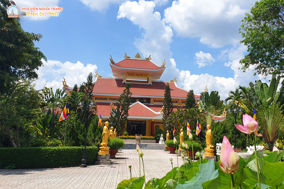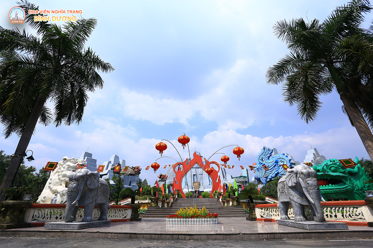 Tại khu nghĩa trang này có nhiều công trình tâm linh hoành tráng như: Vĩnh Hằng Đài, Linh Hoa Tuệ Đàn, Đền Hùng – Cây Đa Hồn Việt, chùa Thiên Phước, tượng Đức mẹ Maria Pieta,… Trong đó, Linh Hoa Tuệ Đàn là một trong những công trình nằm trong không gian kiến trúc trung tâm, tú khí an tịnh của Hoa Viên Bình Dương.