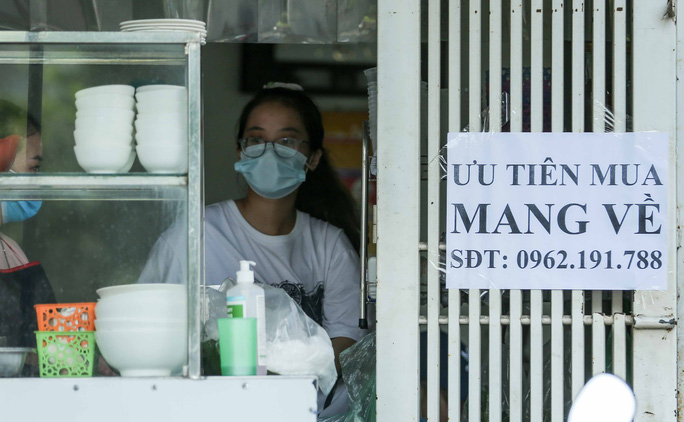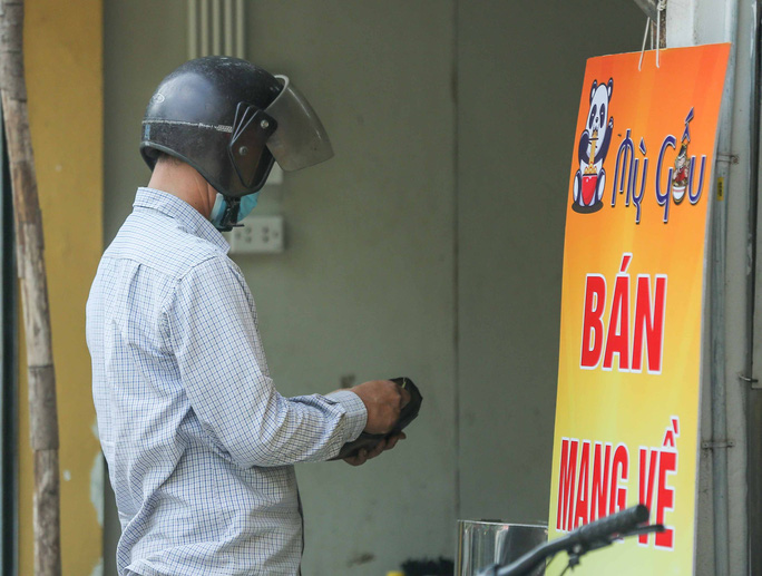 Theo ghi nhận, dọc theo các tuyển đường trên địa bàn TP Hà Nội, nhiều quán ăn, quán cà phê… treo biển "bán hàng mang về" hay "chỉ bán hàng mang về". Những người đến đây lấy hàng đều được nhắc phải đeo khẩu trang, sử dụng nước sát khuẩn và giữ khoảng cách an toàn