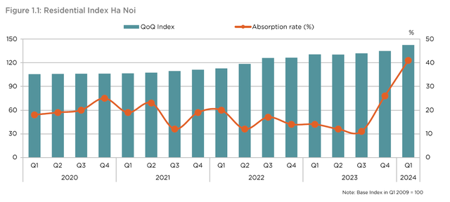 Trong quý I/2024, theo Savills, chỉ số nhà ở tại Hà Nội đã tăng 8 điểm phần trăm so với quý trước lên 142,5. Chỉ số này đã tăng 37% kể từ khi chạm đáy ở mức 104,1 vào quý III/2019. Tại Hà Nội, giá nhà trung bình là 44 triệu VNĐ/m2 diện tích xây dựng (NSA), tăng 8% theo quý.