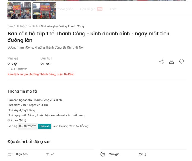 Khảo sát thực tế, một căn hộ tầng 1 diện tích 21m2 tại khu tập thể Thành Công đang được rao bán ở mức 2,6 tỷ đồng (tương đương 123,81 triệu đồng/m2), nhiều căn hộ khác thuộc cùng khu tập thể này cũng tăng giá từ 3 – 5 triệu đồng/m2 thời gian gần đây.