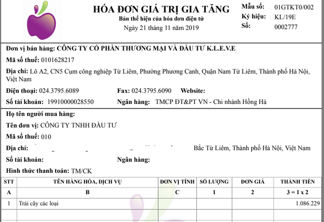 Phóng viên đã yêu cầu xuất hóa đơn cho số hàng nêu trên và đến ngày 21/11, Công ty CP thương mại và đầu tư K.L.E.V.E đã xuất hóa đơn GTGT số 0002777 với nội dung chung chung là "trái cây các loại".