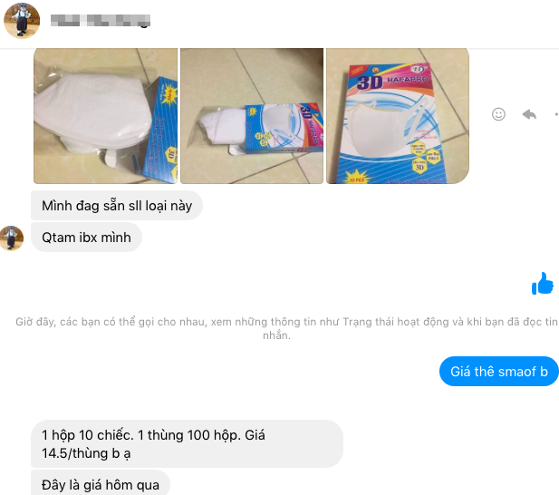 Khẳng định giá khẩu trang 3D rẻ nhất thị trường, nickname Nông Thu Hoài (đến từ Lạng Sơn) quảng cáo: "Một hộp có 10 chiếc, 1 thùng có 100 hộp, nếu mua sỉ thì giá chỉ 14.500.000 đồng/thùng. Hàng công ty nhập tại xưởng ở Bắc Ninh. Bạn ở đâu chúng tôi chuyển đến, nếu bạn mua được ở nơi khác có giá rẻ hơn thì cứ tham khảo. Nếu bạn muốn có giá mềm hơn thì cứ chờ một hai hôm tới xem sao. Tuy nhiên, nếu tình hình dịch có nhiều diễn biến mới thì không chắc chắn là giá khẩu trang sẽ mềm".