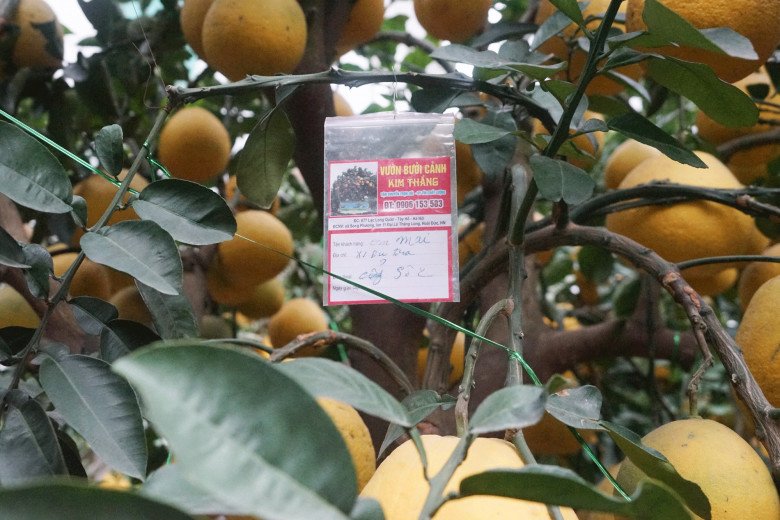 Không chỉ có sản phẩm hơn trăm triệu này, chỉ vào những gốc bưởi đã có cáp treo sẵn trên cây, người đàn ông này cho biết đây đều là những sản phẩm đã có khách đặt hàng, nhà vườn ghi rõ địa chỉ nơi nhận và đợi ngày giao.