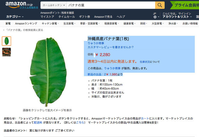 Thế nhưng, lá chuối Việt Nam được cửa hàng online trên Amazon Nhật Bản bán với giá 2.280 yên/lá, tức hơn 500.000 đồng/lá. Nếu mua 2 lá giá chỉ còn 1.980 yên/lá (tương đương hơn 440.000 đồng), mua 3 lá thì giá chỉ khoảng 760.000 đồng và nếu cần sử dụng nhiều thì mua theo "combo" 5 chiếc lá chuối với giá 1.168.000 đồng.
