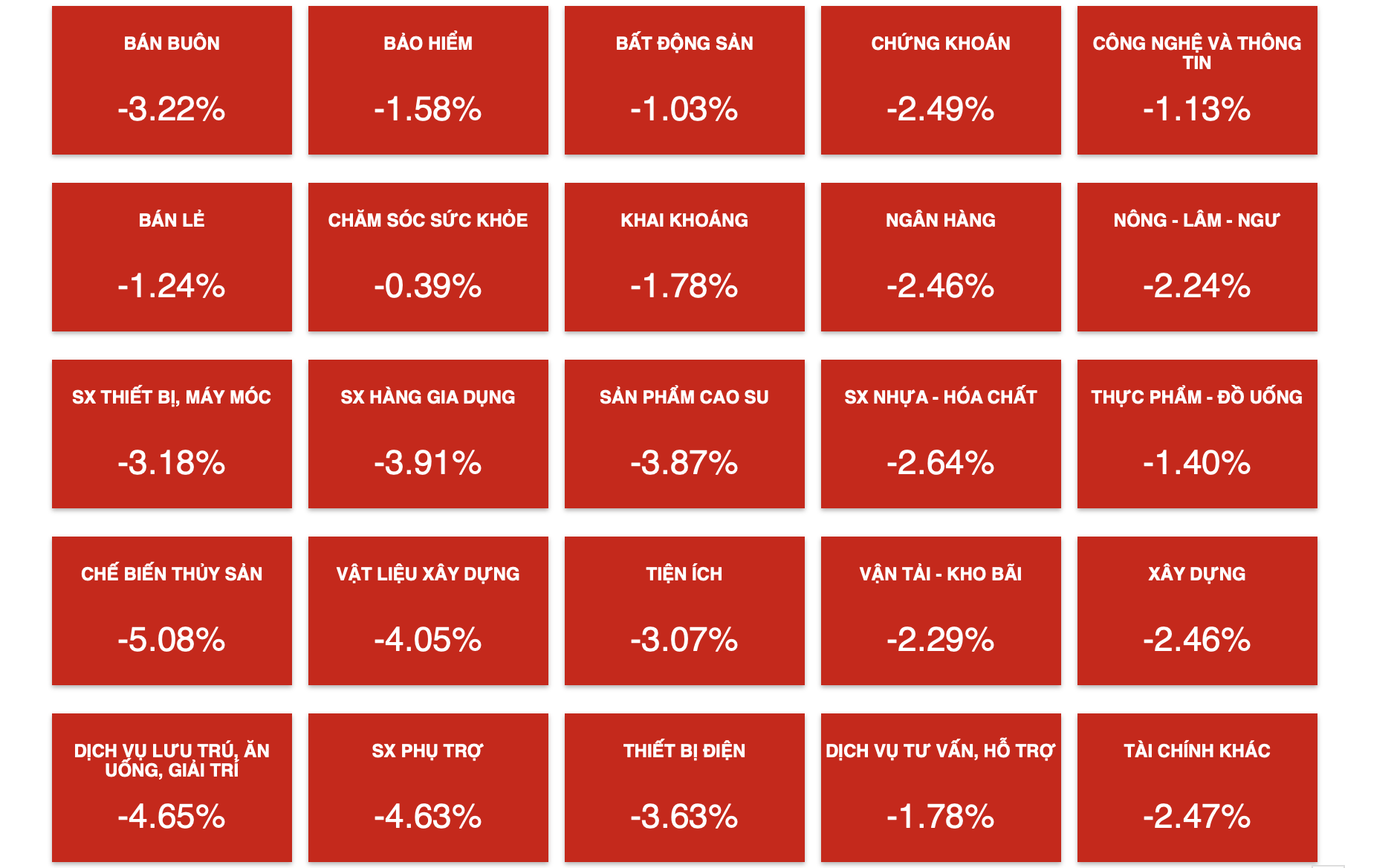 Đóng cửa phiên đầu tuần 6.12, chỉ số VN-Index tiếp tục lao dốc khi giảm tới 29.74 điểm xuống vùng 1.413,58 điểm. Sắc đỏ bao trùm toàn bộ các nhóm ngành trên thị trường chứng khoán.