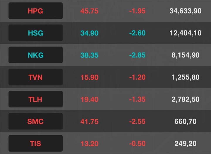 Cổ phiếu TVN giảm sâu 7,02%; SMC mất 5,76%; TIS giảm 3,65%. Mã chứng khoán HSG bám sàn khi mất tới 6,93% còn 34.900 đồng/cổ phiếu.