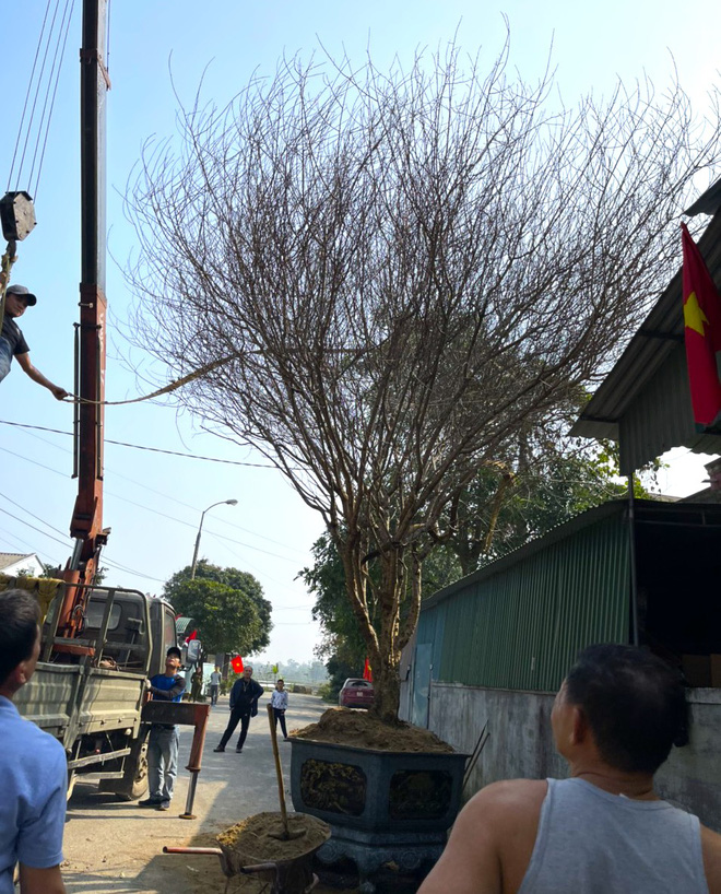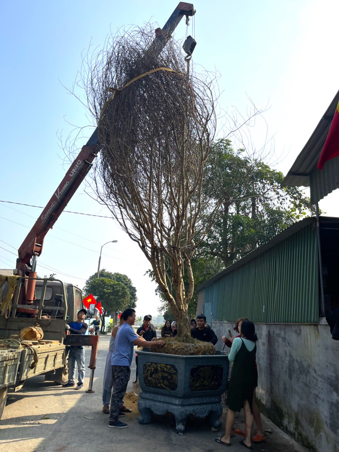 Do kích thước của 2 cây đào này rất lớn nên chị Thương phải thuê 11 người đào và thuê cả máy múc mới có thể đào thành công. Sau khi đào xong, chị Thương thuê 2 chiếc xe cẩu tự hành chở về thành phố Vinh bán.