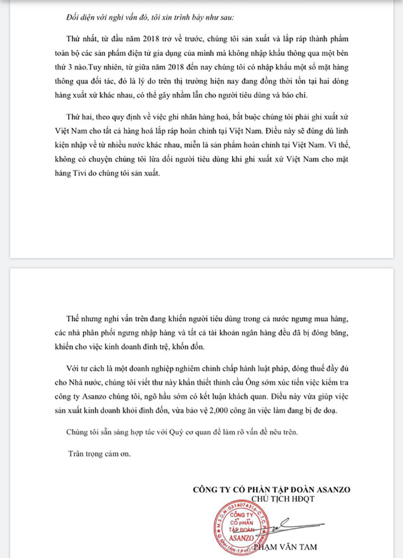 Cụ thể, trong tâm thư, ông Phạm Văn Tam có viết, trong khoảng hai tuần qua, một loạt bài phóng sự đưa tin và đặt nghi vấn là Công ty Asanzo nhập sản phẩm điện tử gia dụng từ Trung Quốc nhưng sau đó thay đổi xuất xứ thành Việt Nam để lừa dối người tiêu dùng.