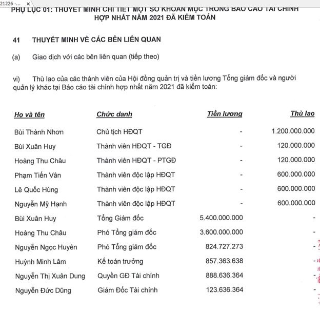 Theo Nhịp Sống Thị Trường, ông Bùi Thành Nhơn giữ chức vụ Chủ tịch HĐQT được trả thù lao 1,2 tỷ đồng, tương đương với mỗi tháng thù lao của ông Nhơn là 100 triệu đồng. 3 thành viên HĐQT khác là ông Phạm Tiến Vân, ông Lê Quốc Hùng và bà Nguyễn Mỹ Hạnh đều nhận thù lao 600 triệu đồng/năm, bằng 1 nửa của ông Nhơn.