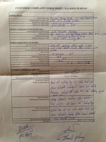 | Dù đã ký vào đơn khiếu nại của Công ty TNHH nhà máy bia Việt Nam, nhưng anh Phong quyết định không giao chai bia lạ, mà yêu cầu phải được gặp trực tiếp người có trách nhiệm giải quyết sự việc. Việc giao sản phẩm mẫu tại công ty cần có biên bản. Ảnh: Zen Nguyễn. |