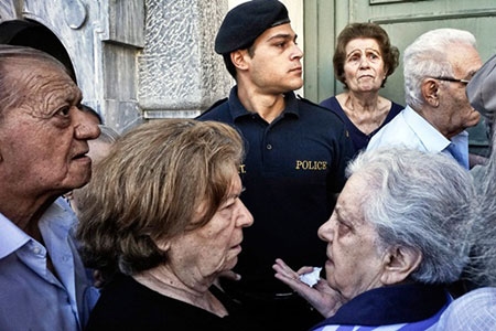 Người Hy Lạp xếp hàng chờ lĩnh lương hưu tại các nhà băng hôm qua. Ảnh: Bloomberg |