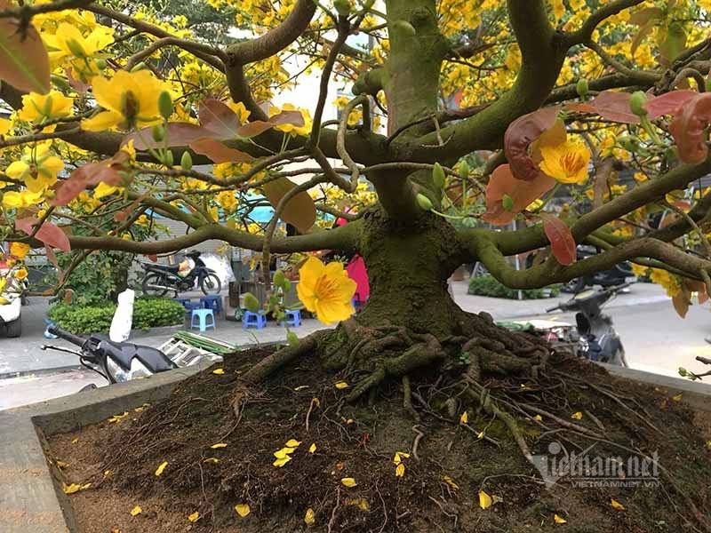 Theo anh Hải, cây mai này có tuổi hơn 20 năm. Trong số cả 100 chậu mai anh chở ra Hà Nội bán dịp tết này thì đây là cây duy nhất được trồng và phát triển tự nhiên, chỉ cần bấm tỉa, không áp dụng uốn thế như các cây mai thông thường.