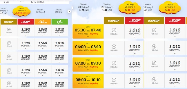Qua khảo sát của PV Tiền Phong trên các kênh bán trực tuyến, hiện hầu hết vé máy bay hạng thương gia chặng Hà Nội - TPHCM từ ngày 20/1/2025 (tức 21 tháng Chạp) đến ngày 2/2/2025 (tức mùng 5 Tết) của Vietjet Air đã hết hàng.