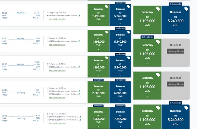 Tương tự, vé máy bay hạng thương gia của Bamboo Airways trong khung giờ 10h35 và 16h20 không còn đặt được chỗ, những khung giờ khác còn sót lại vài ghế. Trong khi đó, vé máy bay hạng phổ thông của hãng này còn từ 1-8 vé trống.