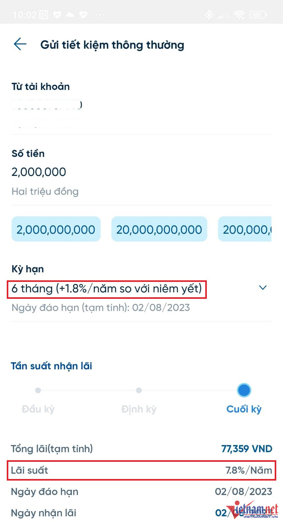 Trong khi đó, Ngân hàng TMCP Ngoại thương Việt Nam (Vietcombank) công bố trên website lãi suất kỳ hạn 6 tháng ngày 2/2 là 6%/năm. Tuy nhiên, lãi suất thực tế ngân hàng trả cho khách hàng là 6,5%/năm. Mức lãi thực tế này được hiển thị ngay trên ứng dụng VCB khi khách hàng thực hiện gửi tiết kiệm online.
