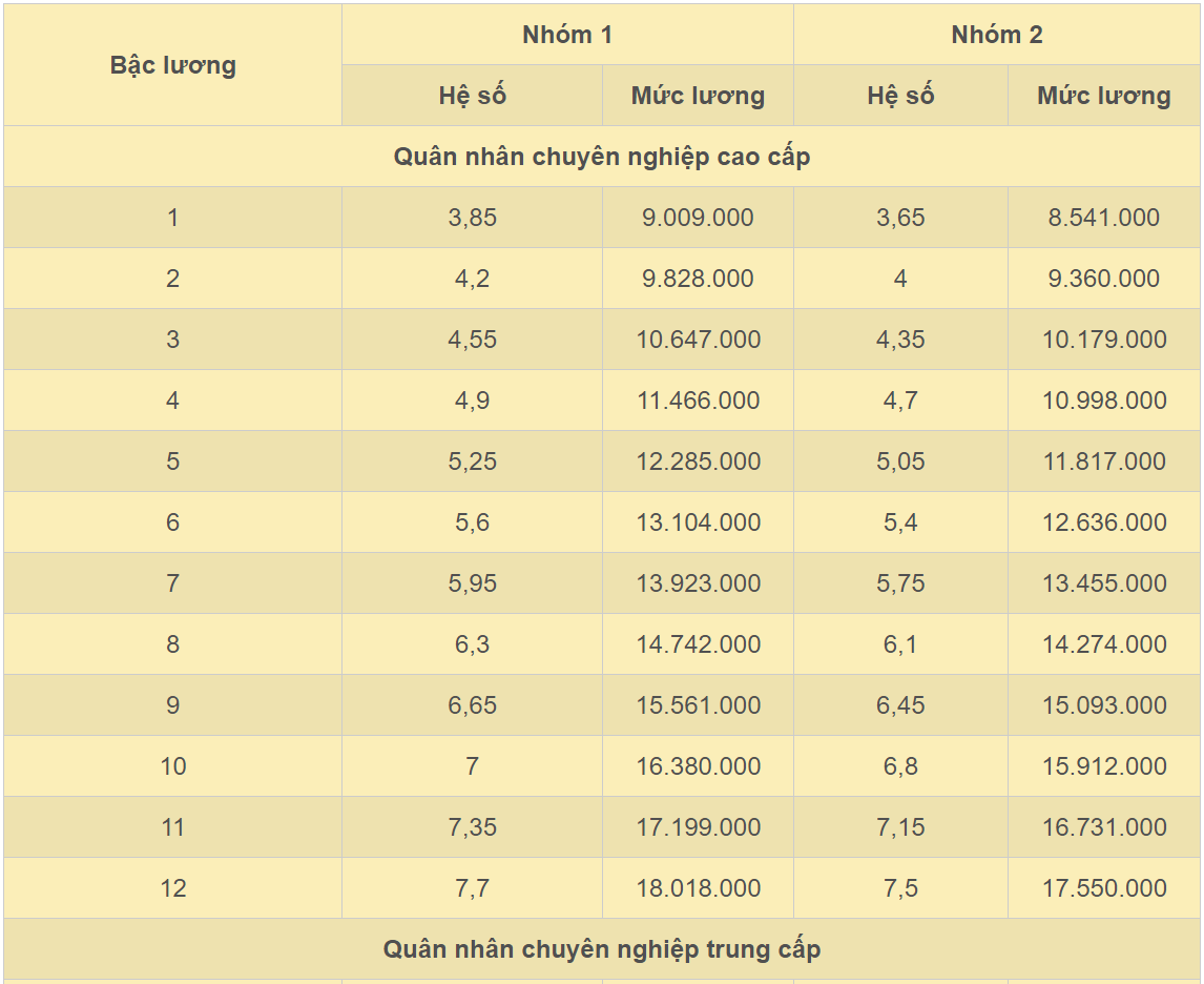 Bảng lương cấp bậc quân hàm: (đơn vị: đồng)